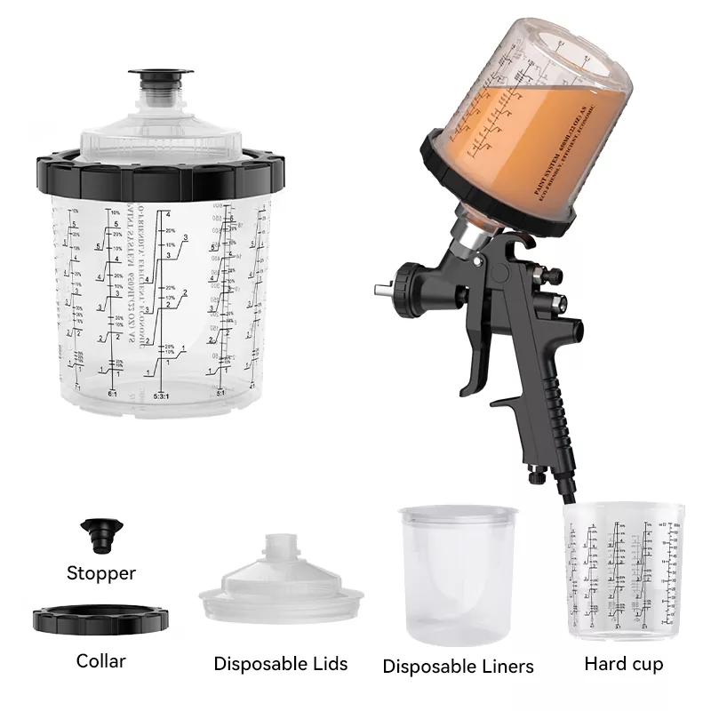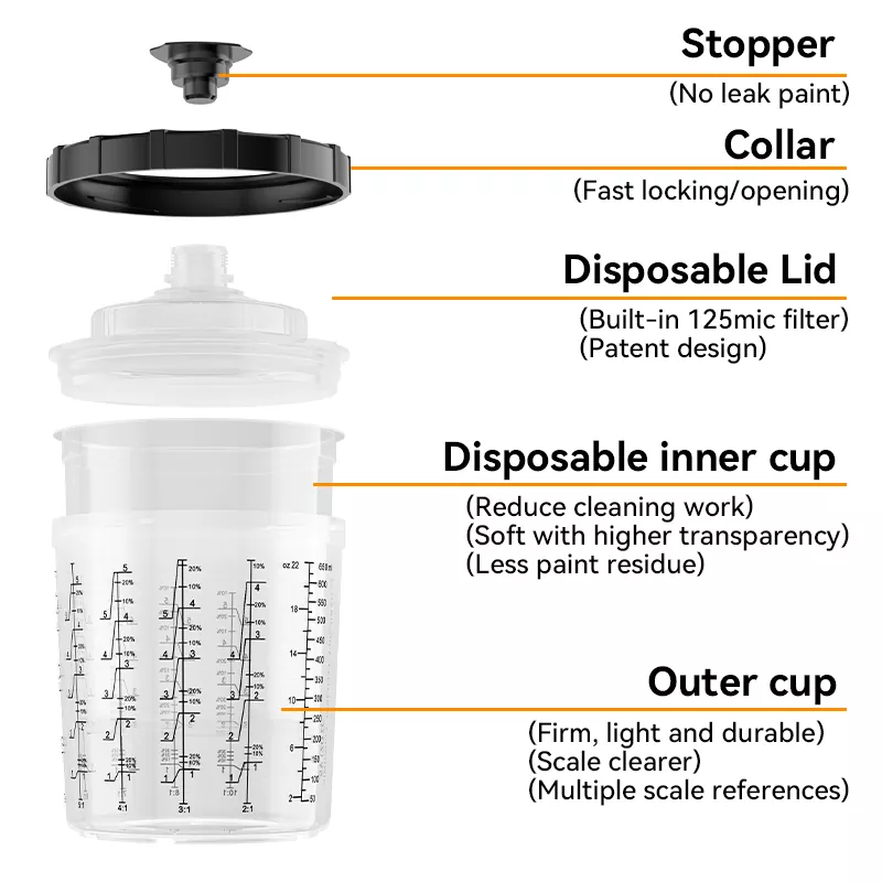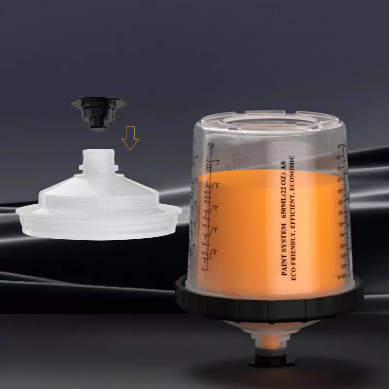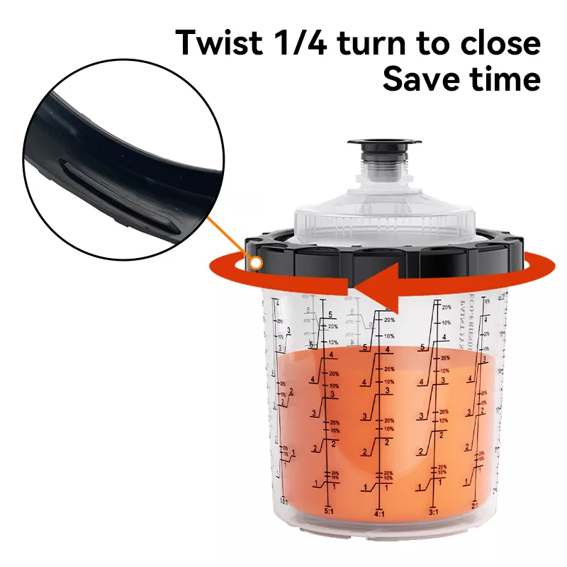 Ní gá ach ¼-casadh gasta a dhéanamh chun an córas cupáin péinte indiúscartha 650ML 2.0 lid a ghlasáil ar an gcupán le coiléar le haghaidh cóimeála níos tapúla agus níos éifeachtaí.