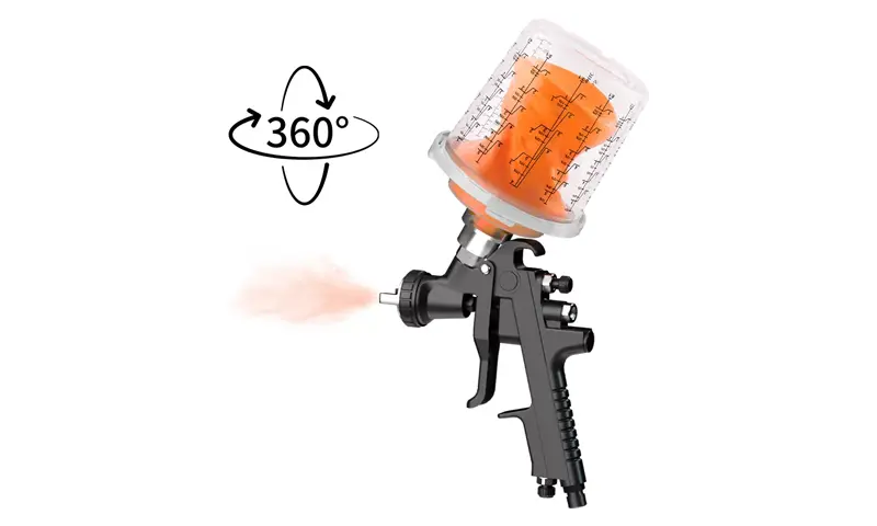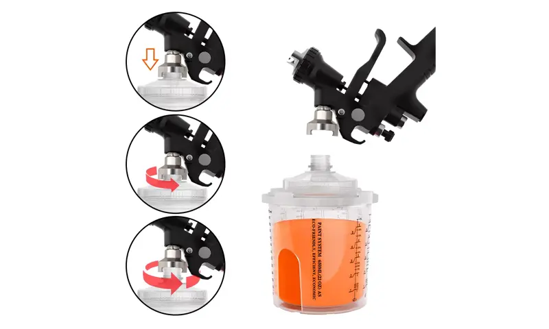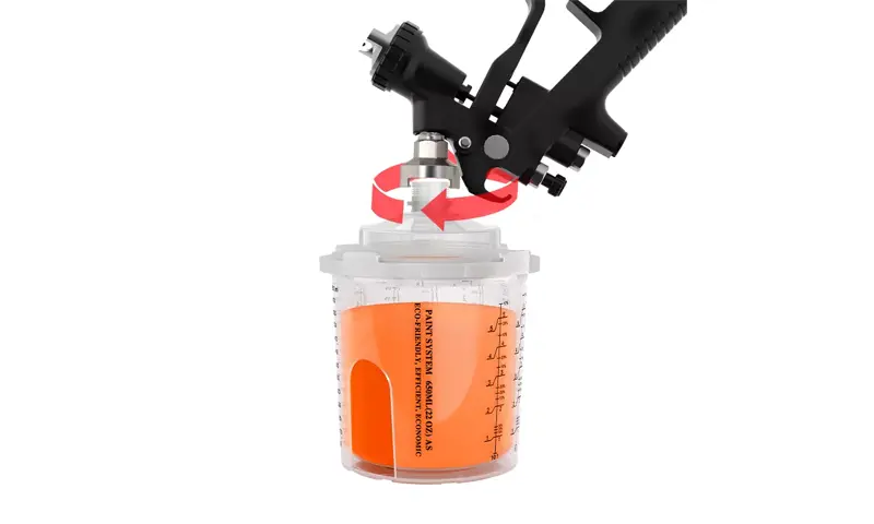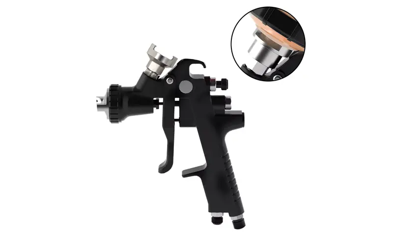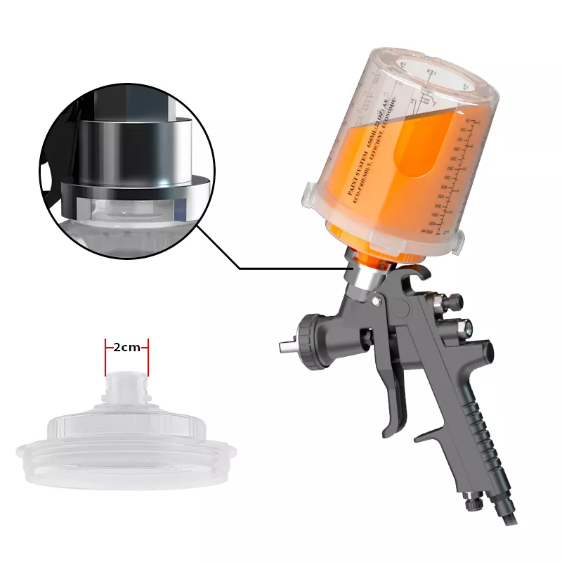 Nascann dearadh buckle comhtháite an spout cupán spraeála indiúscartha an cuibheoir níos dlúithe, rud a fheabhsaíonn cobhsaíocht an naisc idir an cupán spraeála agus an gunna spraeála go mór. Ag an am céanna, déanann trastomhas spout an chupáin mhéadaithe an t -urscaoileadh péint níos tapúla agus níos aonfhoirmeach, rud a fheabhsaíonn an éifeacht spraeála go mór.