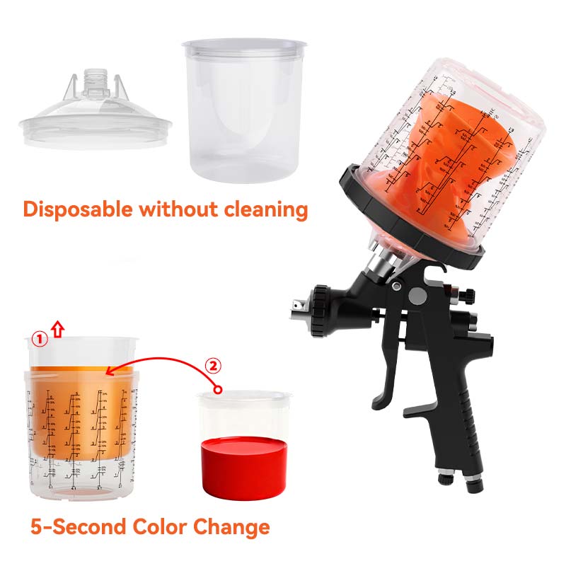 Tá ancupán gunna spraeála indiúscartha éilíonn aon ghlanadh tar éis é a úsáid; go simplí caith an cupán istigh chun dathanna a athrú go tapa, ag laghdú an t-eatramh athraithe dath ó 20 nóiméad go 5 soicind, ag dúbailt an táirgeadh laethúil go héifeachtach. Tá scagaire fíneáil ionsuite ar an gclúdach chun neamhíonachtaí a scagadh go héifeachtach, ag cinntiú spraeála aonfhoirmeach agus réidh, rud a fhágann go bhfuil bailchríoch ar chaighdeán níos airde.