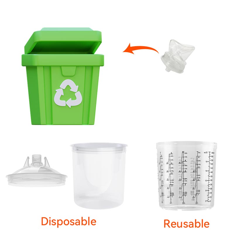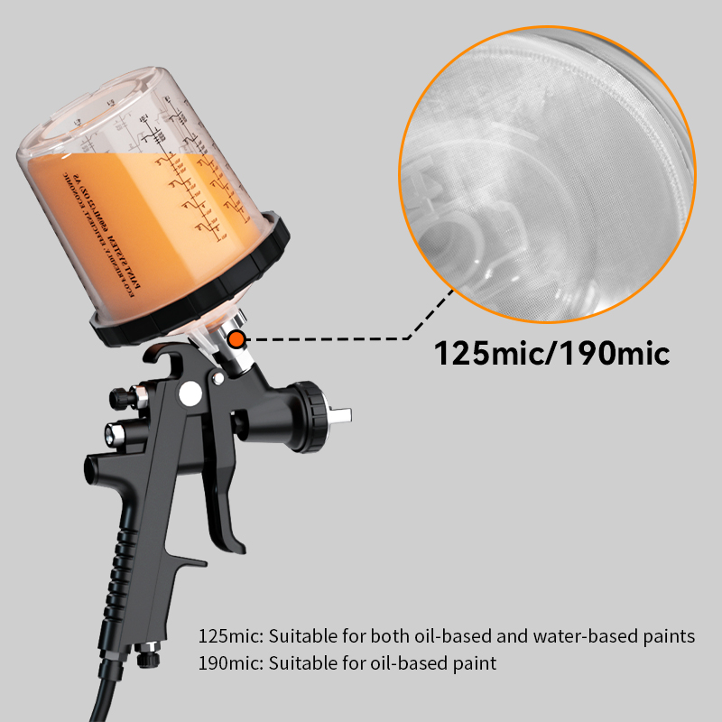 • Scagairí comhtháite ionsuite le haghaidh bailchríoch péint níos fearr: Gnéithe an caipín cupán spraeála indiúscartha scagairí 190μ (péint ola-bhunaithe) agus 125μ (péint uisce-bhunaithe) a tógadh isteach, neamhíonachtaí a scagadh go héifeachtach le linn spraeáil agus snasta péint a mhéadú 20%.