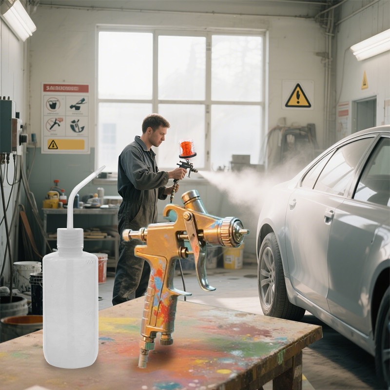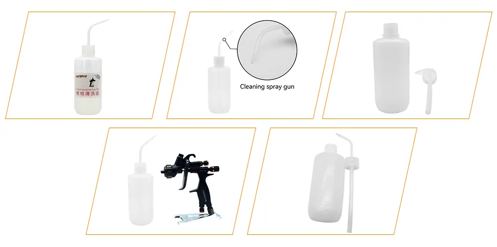 Is uirlis éifeachtach glantacháin gunna spraeála é pota níocháin gunna spraeála AySpat le héifeacht glantacháin den scoth. Is féidir leis an bpéint atá fágtha sa ghunna spraeála a shruthlú go tapa, ar féidir leis na codanna beachta taobh istigh den ghunna spraeála a chosaint níos fearr. Is furasta an pota níocháin gunna spraeála a oibriú, agus is féidir an déine agus an treo sreafa leachtach a rialú go beacht tríd an gcomhlacht buidéal a fháscadh. Tar éis na hoibríochta péinteála, bain úsáid as an bpota níocháin gunna chun an tuaslagóir a luchtú chun stains na bpíopaí casta taobh istigh den ghunna spraeála a shruthlú, ar féidir leis an gunna spraeála a choinneáil agus a shaol seirbhíse a leathnú go suntasach. Tá an buidéal níocháin gunna déanta as ábhar PP bog agus éadrom, atá frithsheasmhach in aghaidh creimthe ag tuaslagóirí amhail aicéatón agus tolúéin. Is réiteach idéalach é do do chothabháil gunna spraeála.